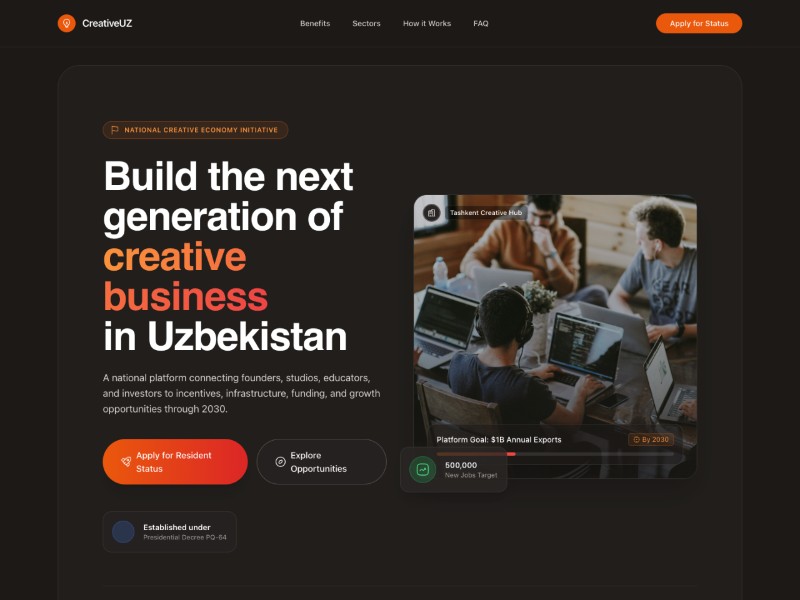 Primary use case: promoting a government-backed or ecosystem-led platform that attracts creative businesses, startups, and partners.