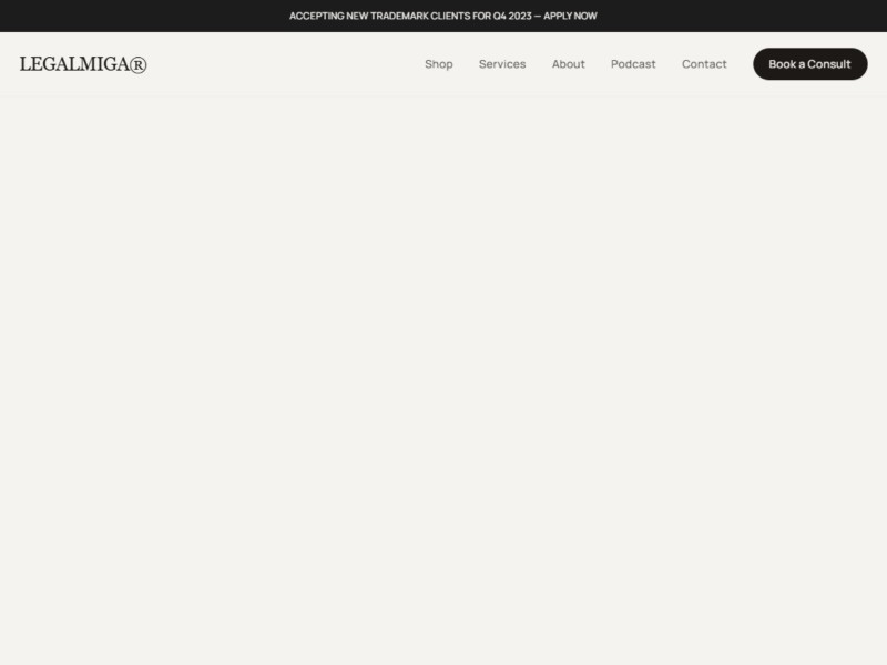 A polished, brand-forward landing page template for boutique creative law firms and legal service providers to showcase services, founder, and contract shop.