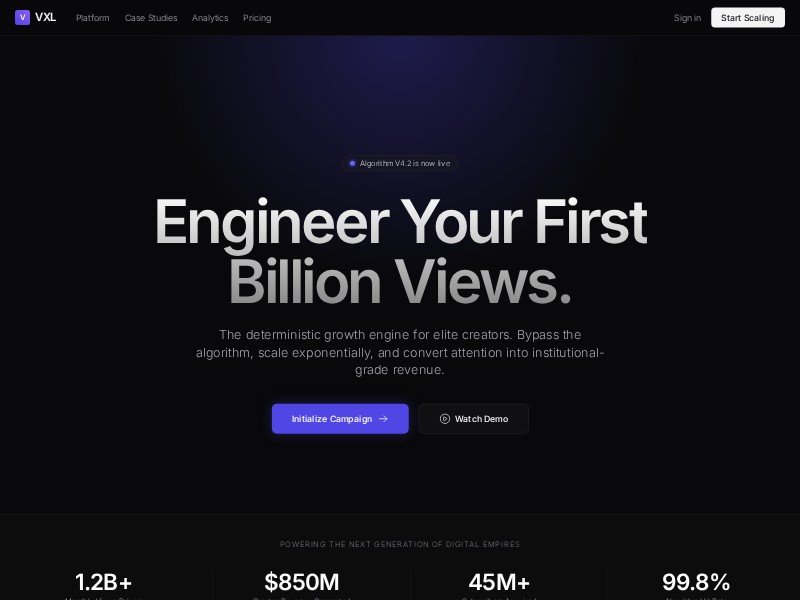 A bold, cinematic landing page template for creator growth platforms, analytics tools, and media optimization services. It combines premium dark visuals with persuasive copy focused on scaling views, retention, and monetization.