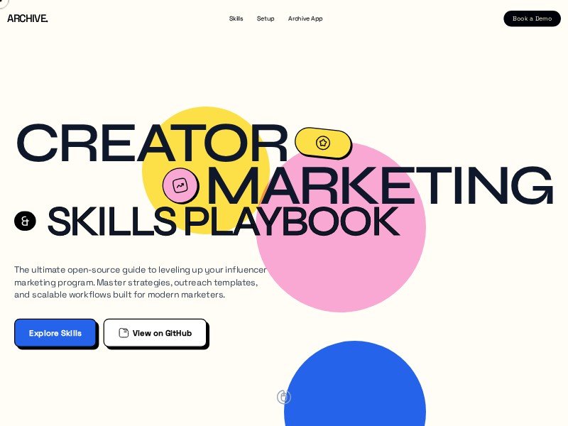 A bold, colorful landing page template built to present an open-source creator marketing skills playbook and drive product demos.