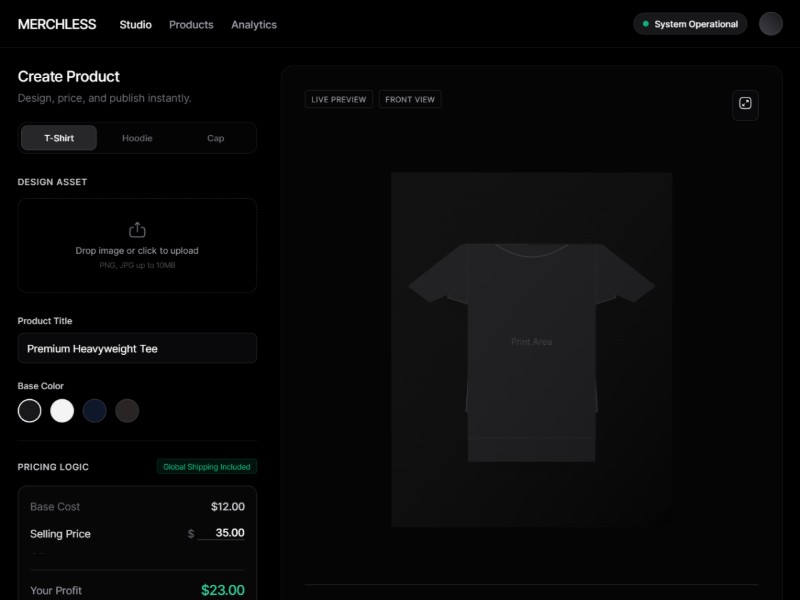 A dark, minimal Creator Studio UI template for designing, pricing, and previewing print-on-demand apparel products before publishing them online.