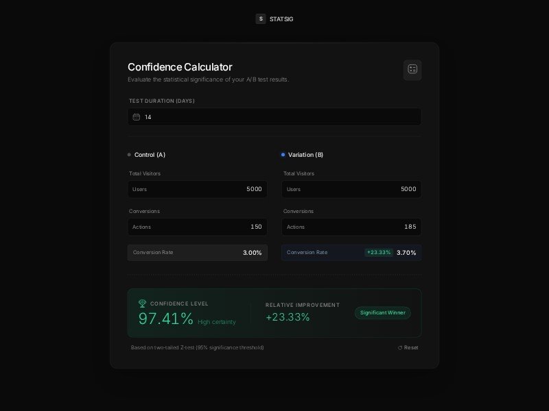 CRO Confidence Calculator Tool Template gives experimentation teams a sleek, dark-mode widget to embed on landing pages or internal tools.