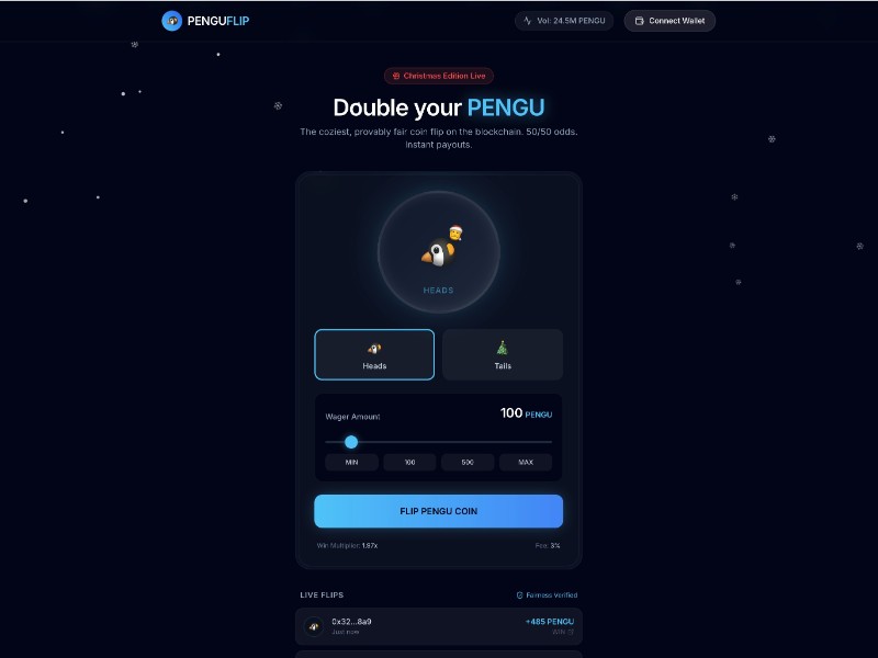 A reusable landing page template for a Christmas-themed, provably fair crypto coin-flip game with wallet connect, live history, and animated UI.