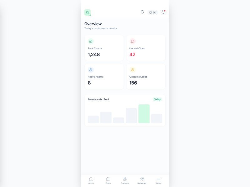 A reusable mobile CRM and live chat dashboard template for teams managing conversations, contacts, broadcasts, and support workflows.