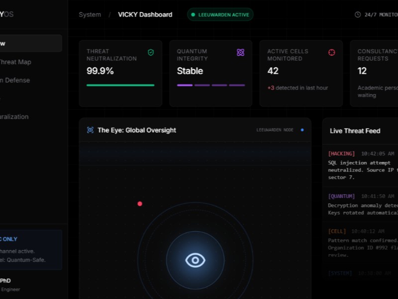 VICKYOS Cybersecurity Dashboard UI Template delivers a cinematic, dark-mode control center for showcasing advanced threat monitoring and quantum-safe defenses.