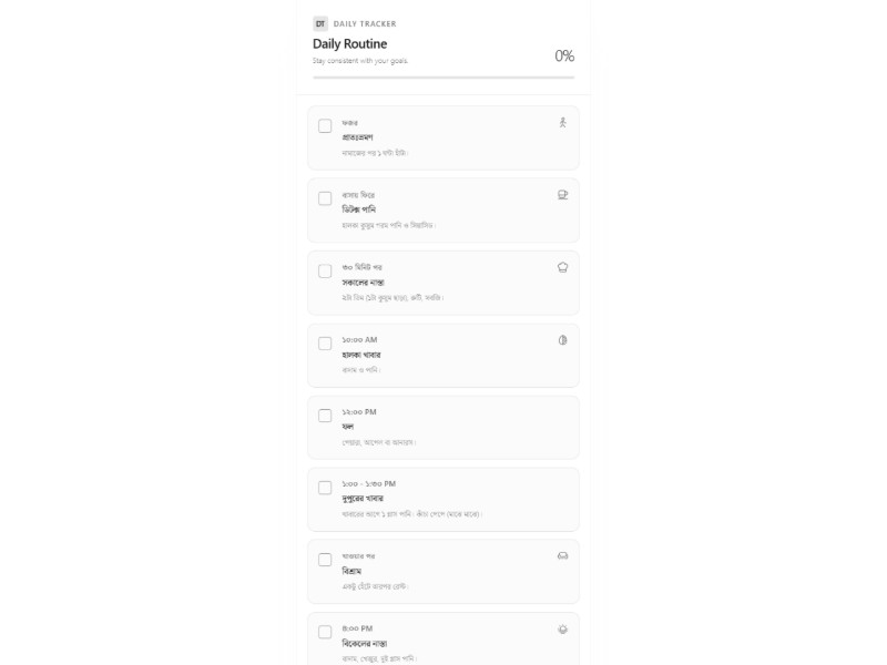 A reusable mobile-first Daily Diet Tracker Template to visualize routines with checklists, progress bar, and timeline-style diet tasks.