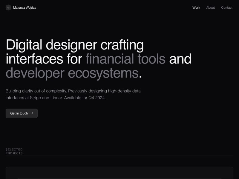 Ideal for portfolios featuring fintech, developer tools, and data-dense interfaces, this template lets you swap in your own name, projects, and screenshots while preserving a polished, narrative-driven structure.
