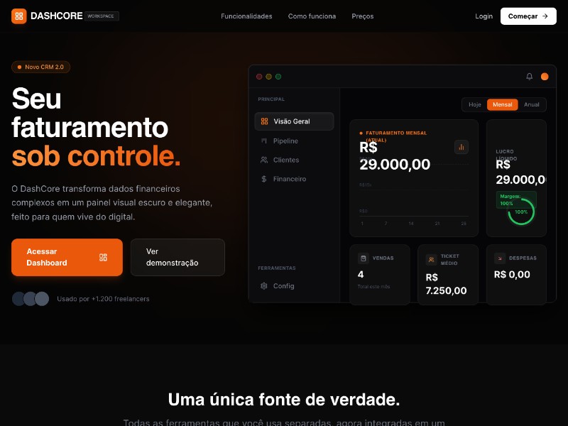 A conversion-focused, dark-mode landing page template for promoting a DashCore-style financial CRM or dashboard product aimed at freelancers and digital businesses.