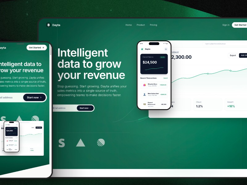 Realistic product mockups Desktop dashboards and mobile analytics views designed to showcase revenue, user, and performance metrics.