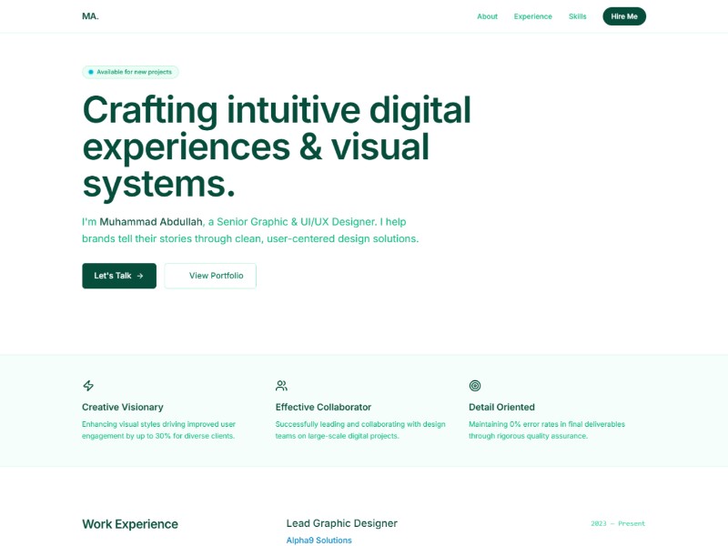 - Hero section with availability badge, headline, and primary CTAs (“Hire Me”, “Let’s Talk”, “View Portfolio”).