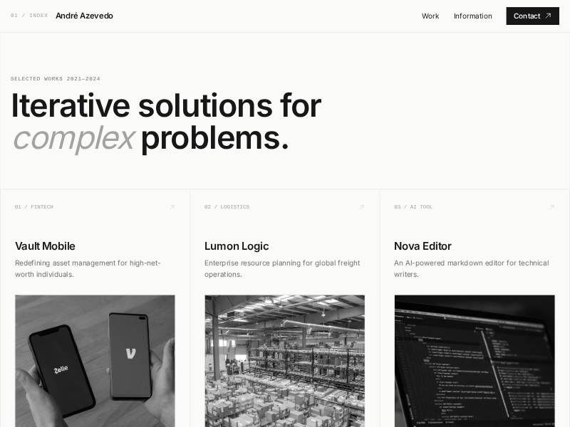 A refined, minimal portfolio template built for designers to present selected works, articulate challenges and solutions, and highlight real-world impact.