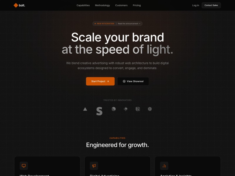 - Capabilities grid for services like web development, digital advertising, and analytics