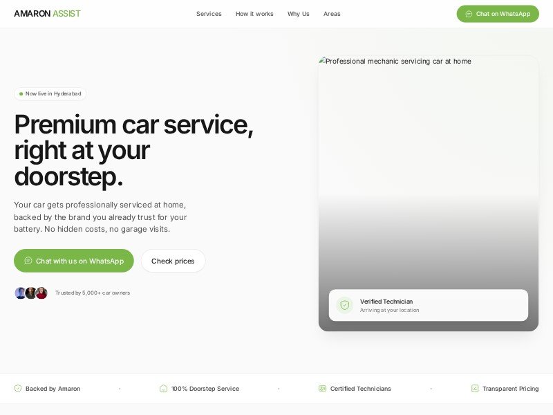 - Hero section with strong convenience-led messaging and primary WhatsApp CTA