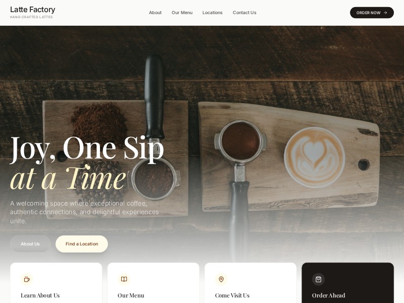 Latte Factory is a warm, modern coffee shop landing page template crafted for cafés and community-focused hospitality brands.