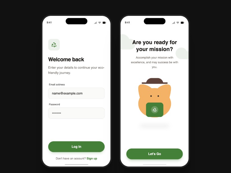 Use this template as a starting point for designing or prototyping eco, recycling, or environmental engagement apps with a friendly, gamified feel.