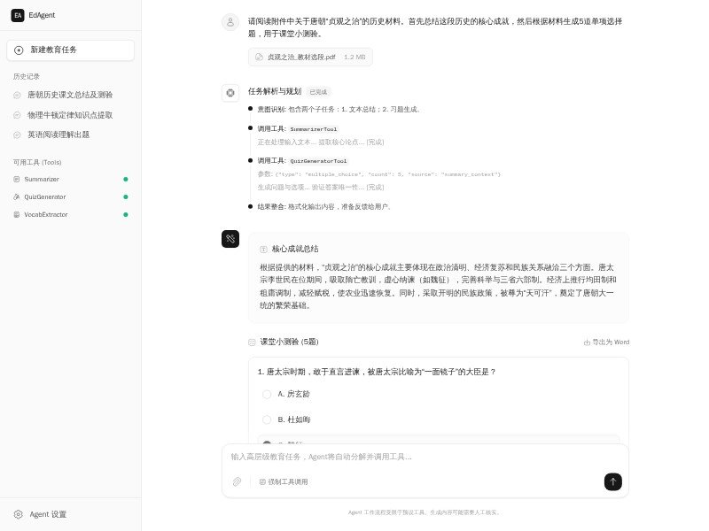 A reusable education AI agent template for building task-based classroom assistants that summarize materials, generate quizzes, and manage learning workflows.