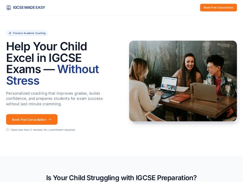 A reusable landing page template for IGCSE tutoring, academic coaching, and exam prep services to convert parents into consultation bookings.
