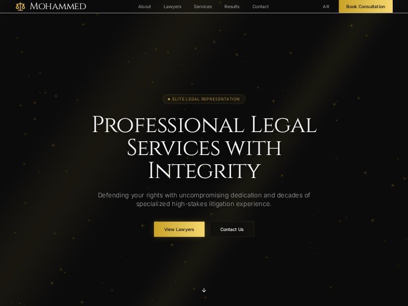 A premium, dark-themed landing page template specifically crafted for legal professionals and elite law firms. It features a sophisticated aesthetic with gold accents, smooth animations, and full English-Arabic support.