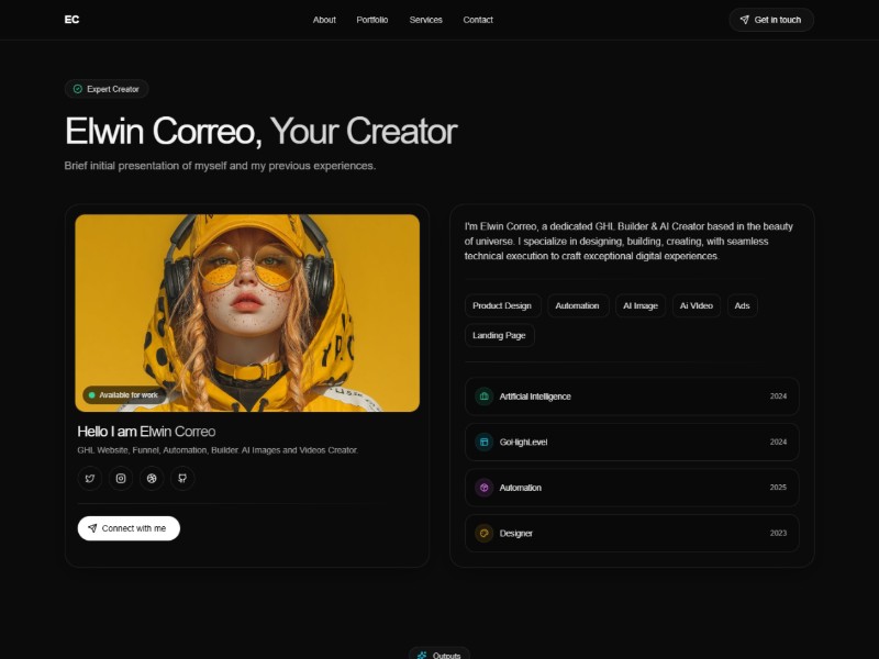 A sleek, dark portfolio template for showcasing a modern creative practice, ideal for designers, GHL builders, and AI creators.