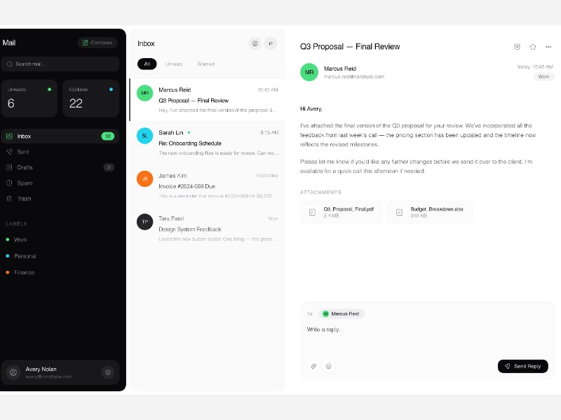 A reusable email inbox UI template for building modern mail clients, internal communication tools, or productivity dashboards with a clean dark-light layout. Built by https://hanif.studio