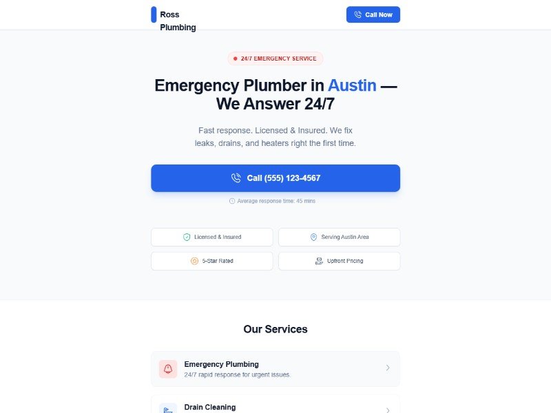 - Services grid for highlighting core offerings like repairs, leak detection, and drain cleaning