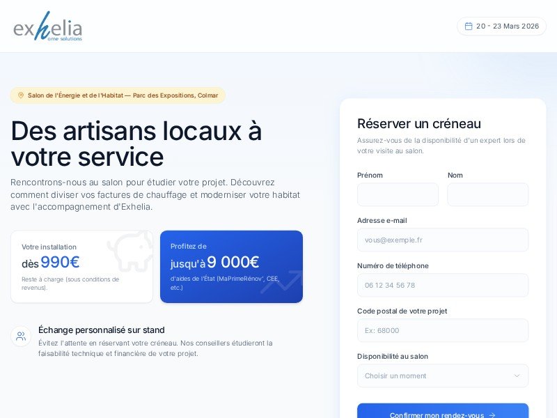 A focused landing page template for salons and expos in the energy and home renovation space, optimized to capture qualified appointments.