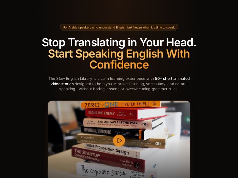 A dark, modern landing page template built for promoting English learning programs, digital courses, or private membership libraries with a calm, trust-building sales flow.