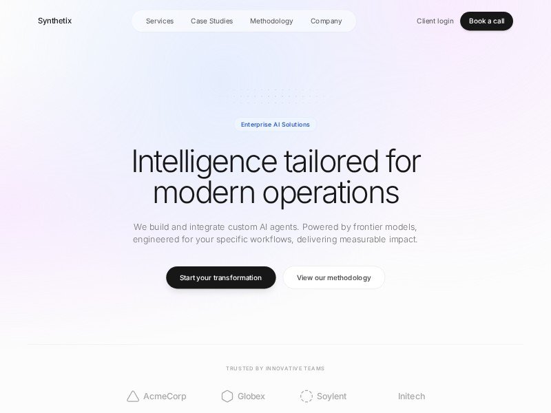 A polished, conversion-focused template for agencies and consultancies selling custom AI agents, workflow automation, and secure enterprise deployments.