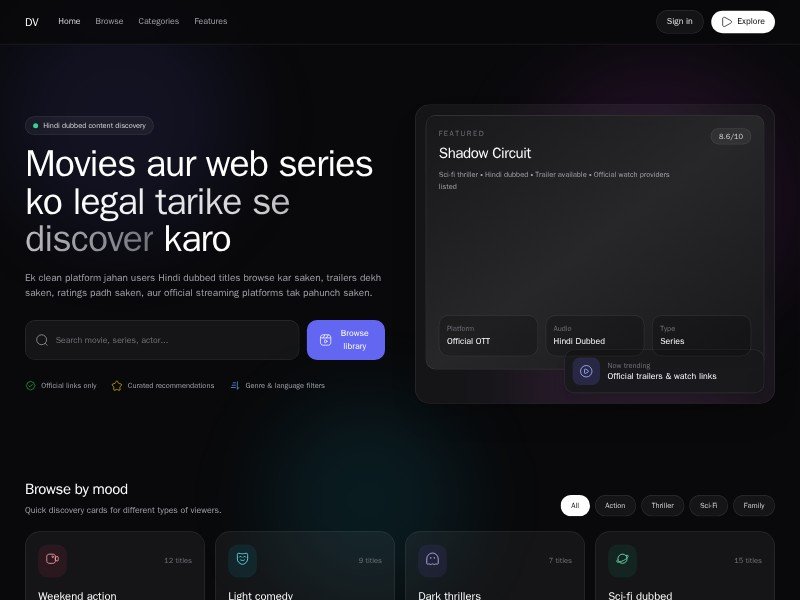 A dark, modern landing page template for launching a legal movie and web series discovery platform focused on Hindi-dubbed content and official streaming access.
