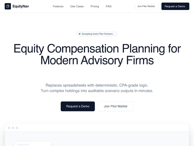 Primary Use Case: Use this template to quickly launch or prototype a brand-forward landing page for equity compensation, tax planning, or fintech advisory software, then customize copy and visuals to your product.