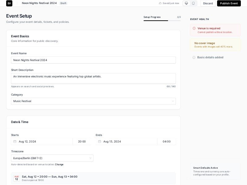 This Event Editor UI Template provides a robust framework for building event management platforms or organizer dashboards. It features a clean, professional aesthetic with a focus on usability and data entry efficiency.