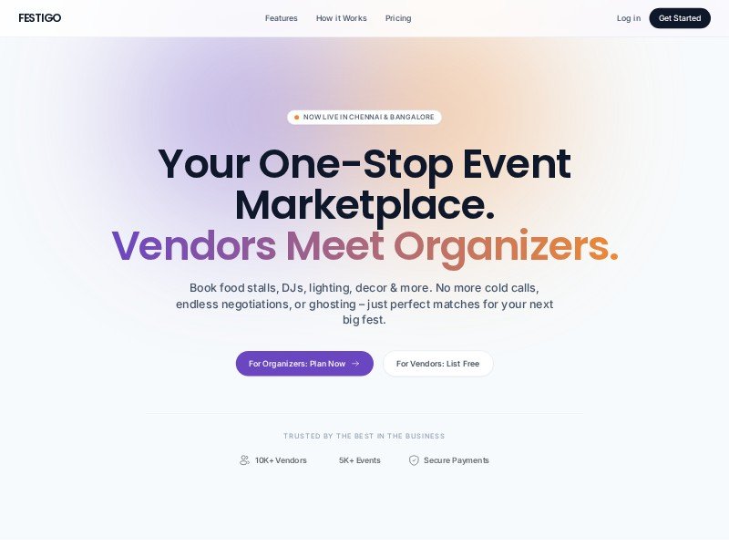 This template is ideal for startups building event tech products, regional vendor platforms, or college fest planning tools. Its clean visual style, gradient accents, and conversion-focused structure make it easy to adapt for marketplaces in events, services, and local bookings.