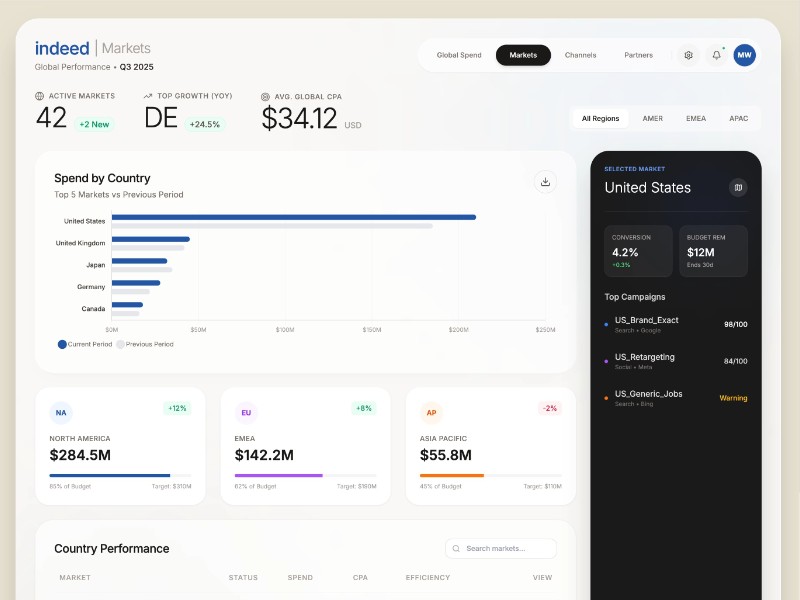 - Country performance table with status, CPA, and efficiency bars