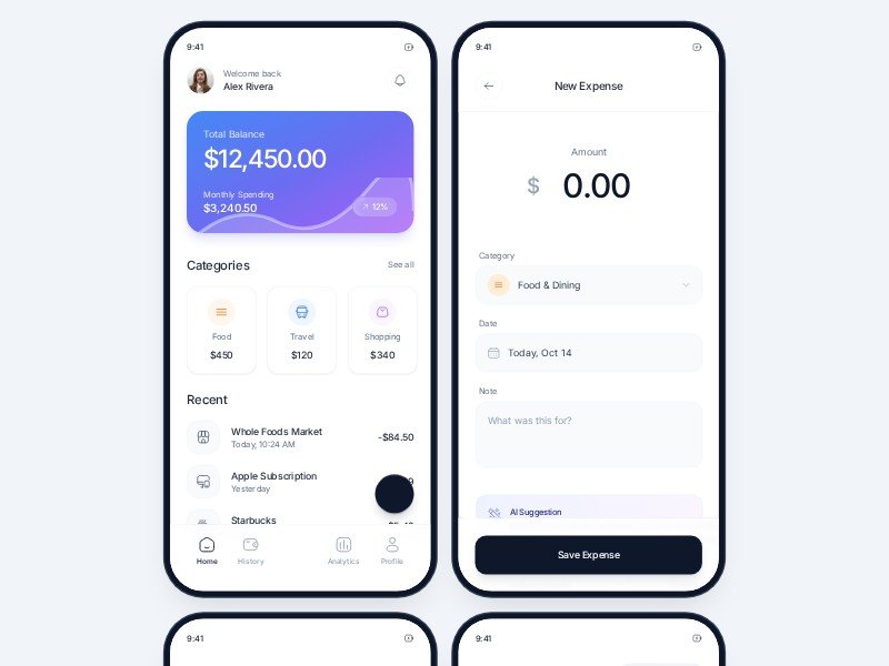 A polished mobile expense tracker template designed for personal finance products, budgeting apps, and fintech MVPs. It includes multiple app screens that showcase core money-management flows in a modern, user-friendly interface.
