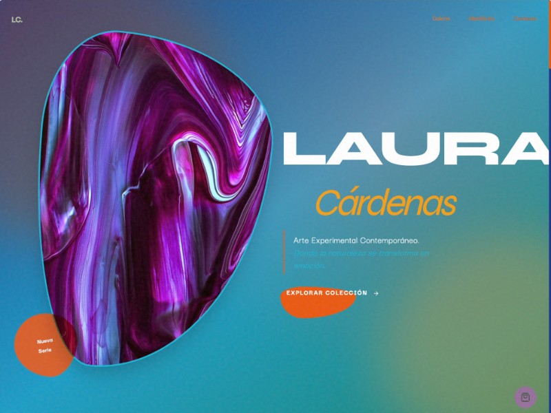 A bold, Spanish-language portfolio template for showcasing experimental, gallery-ready artwork with immersive gradients, organic shapes, and large-type storytelling.