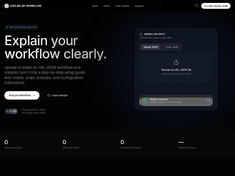 A sleek dark landing page template for showcasing an n8n workflow analyzer or automation documentation tool. It helps users upload or paste workflow JSON and generate readable setup instructions.