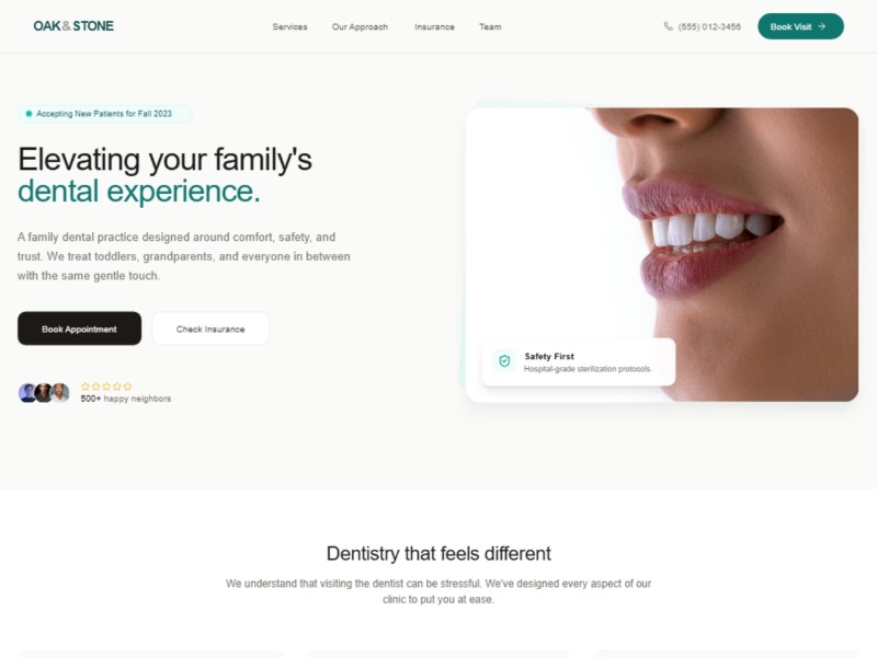 Oak & Stone Family Dental is a clean, modern landing page template built for family and cosmetic dental practices.