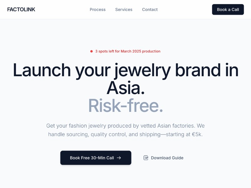 Factolink Fashion Jewelry Agency Landing Page Template is a clean, conversion-focused layout for production and sourcing agencies working with fashion jewelry brands.