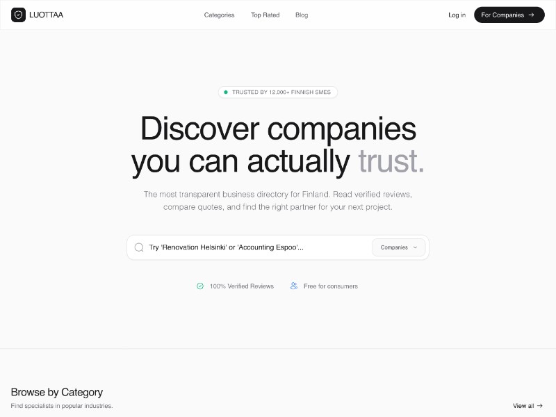 A modern Luottaa-style landing page template for a Finnish business review and company directory platform, ready to customize for your own marketplace.