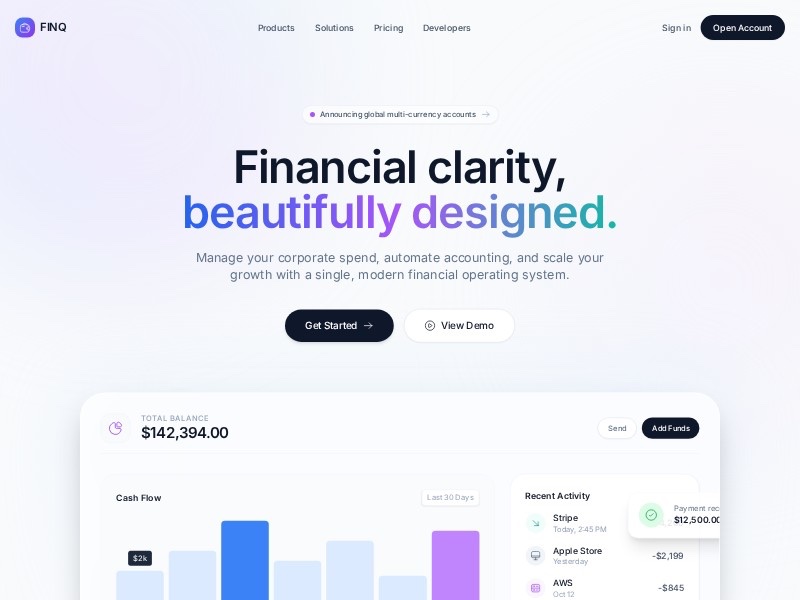 Primary use case: launching a fintech SaaS, banking platform, treasury tool, or expense management product with a premium, modern visual style.