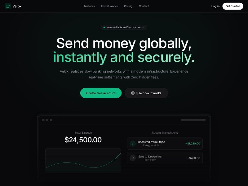 Velox Fintech Payments Landing Page Template delivers a sleek, dark-mode experience tailored for modern payment and finance products.