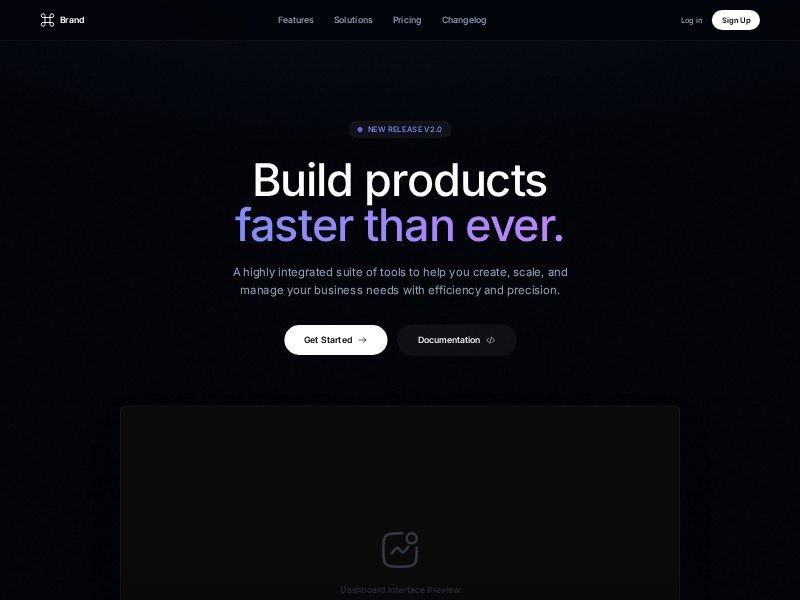 - Hero section with bold headline, dual CTAs, and dashboard preview