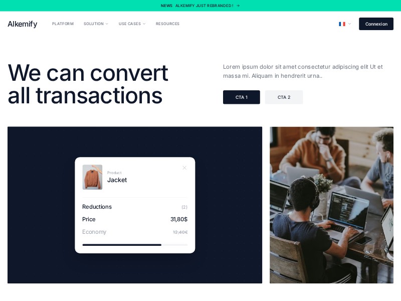Alkemify is a sleek fintech SaaS landing page template tailored for transaction, payment, and intelligence platforms.