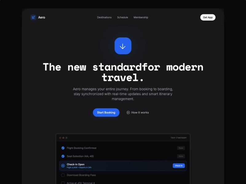 A sleek Aero-branded hero landing page template for modern flight booking and travel apps, featuring itinerary UI, benefits, and clear CTAs.
