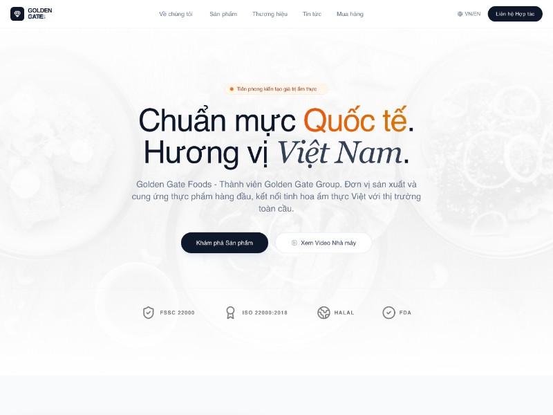 - Hero section with strong value proposition, dual CTAs, and certification strip (FSSC, ISO, Halal, FDA).