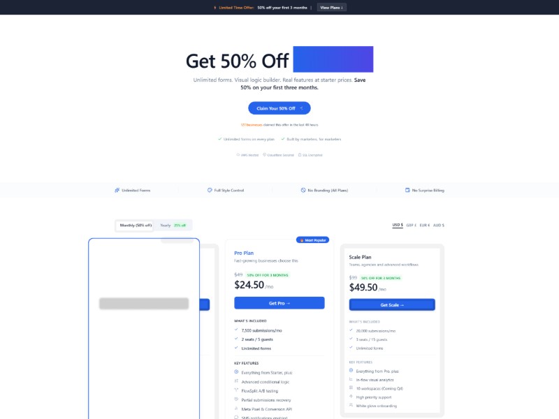 A conversion-focused landing page template built for form builders and marketing SaaS products running limited-time offers and tiered pricing.