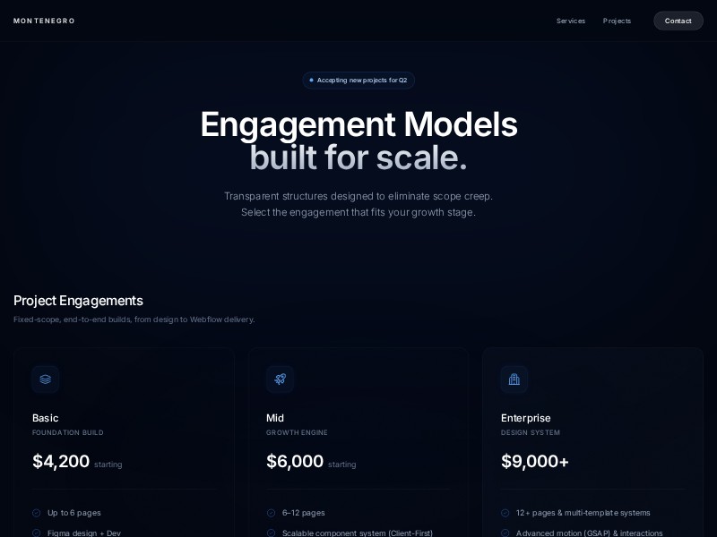 Montenegro Webflow Pricing Template is a dark, modern landing page built to present freelance or studio Webflow services, pricing tiers, and retainers with clarity.