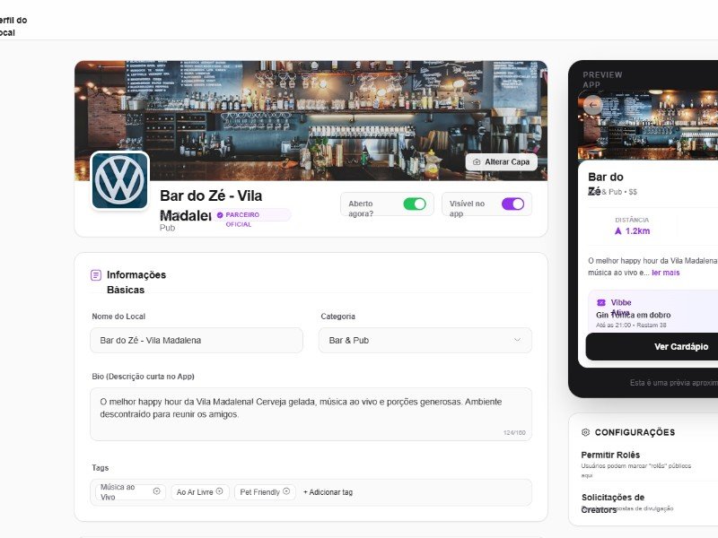 - Painel de parceiro para apps de bares e nightlife