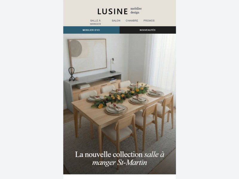 A modern LUSINE-inspired landing page template for showcasing designer dining room furniture collections and promotions in an editorial e-commerce layout.