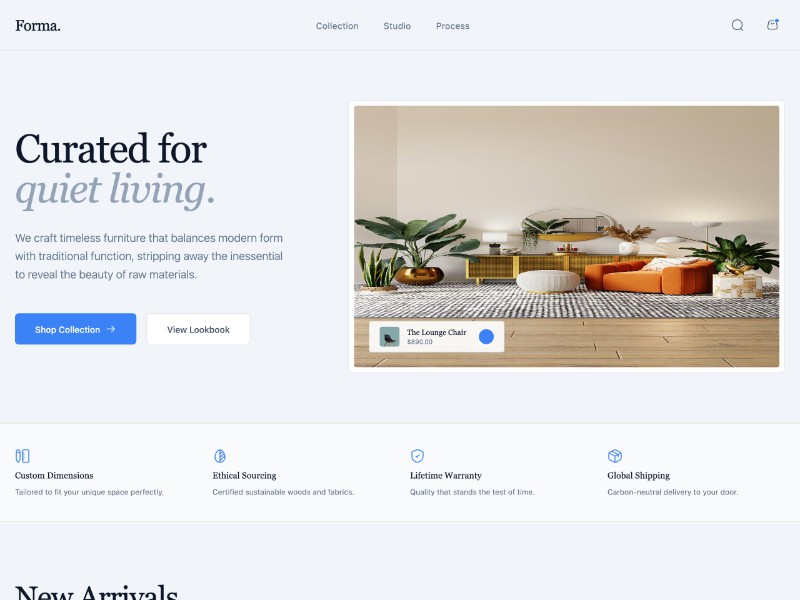 A refined, minimalist e-commerce layout for furniture and interior brands, built around storytelling, curated products, and studio credibility.